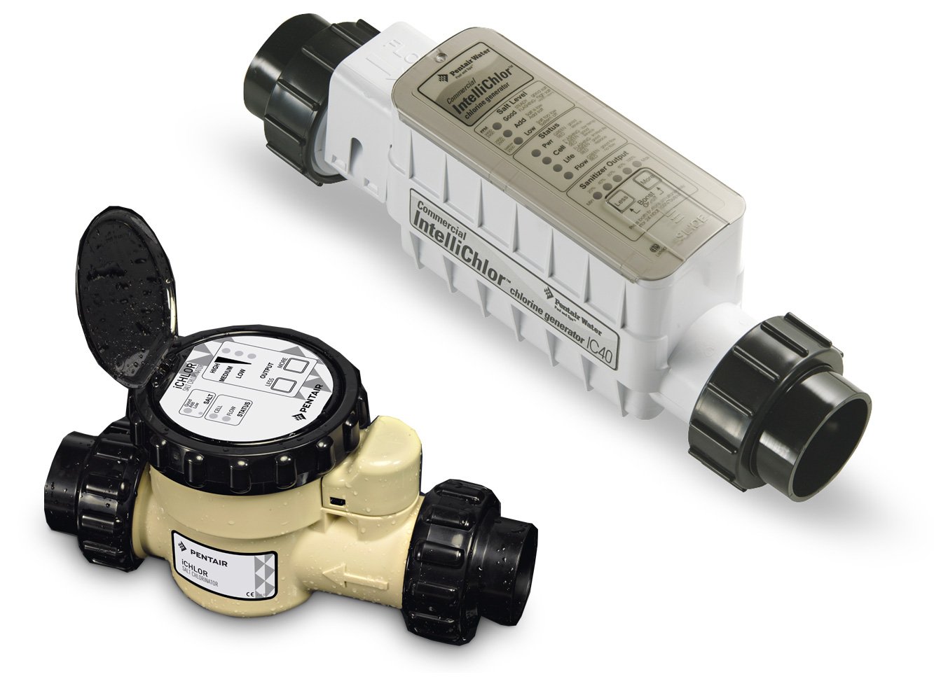 Pentair’s salt chlorine generators, such as the IntelliChlor (IC20, IC40, IC60) and iChlor, provide efficient, low-maintenance pool sanitization by converting table salt into chlorine, eliminating the need for manual chlorine handling. Designed for pools up to 60,000 gallons (IntelliChlor) and smaller pools up to 30,000 gallons (iChlor), these systems feature advanced diagnostics, adjustable chlorine output, and automation compatibility with Pentair’s IntelliCenter for remote monitoring.
